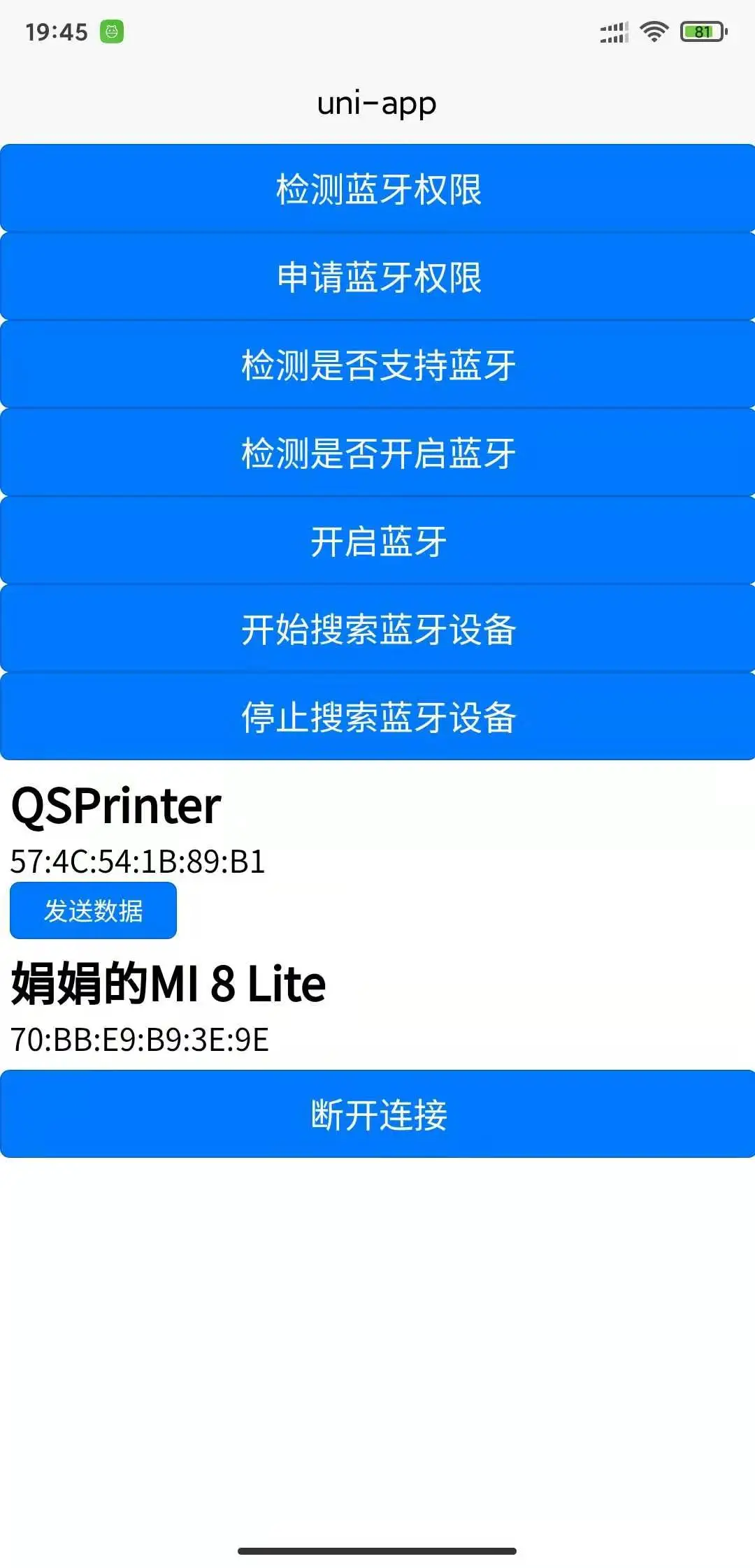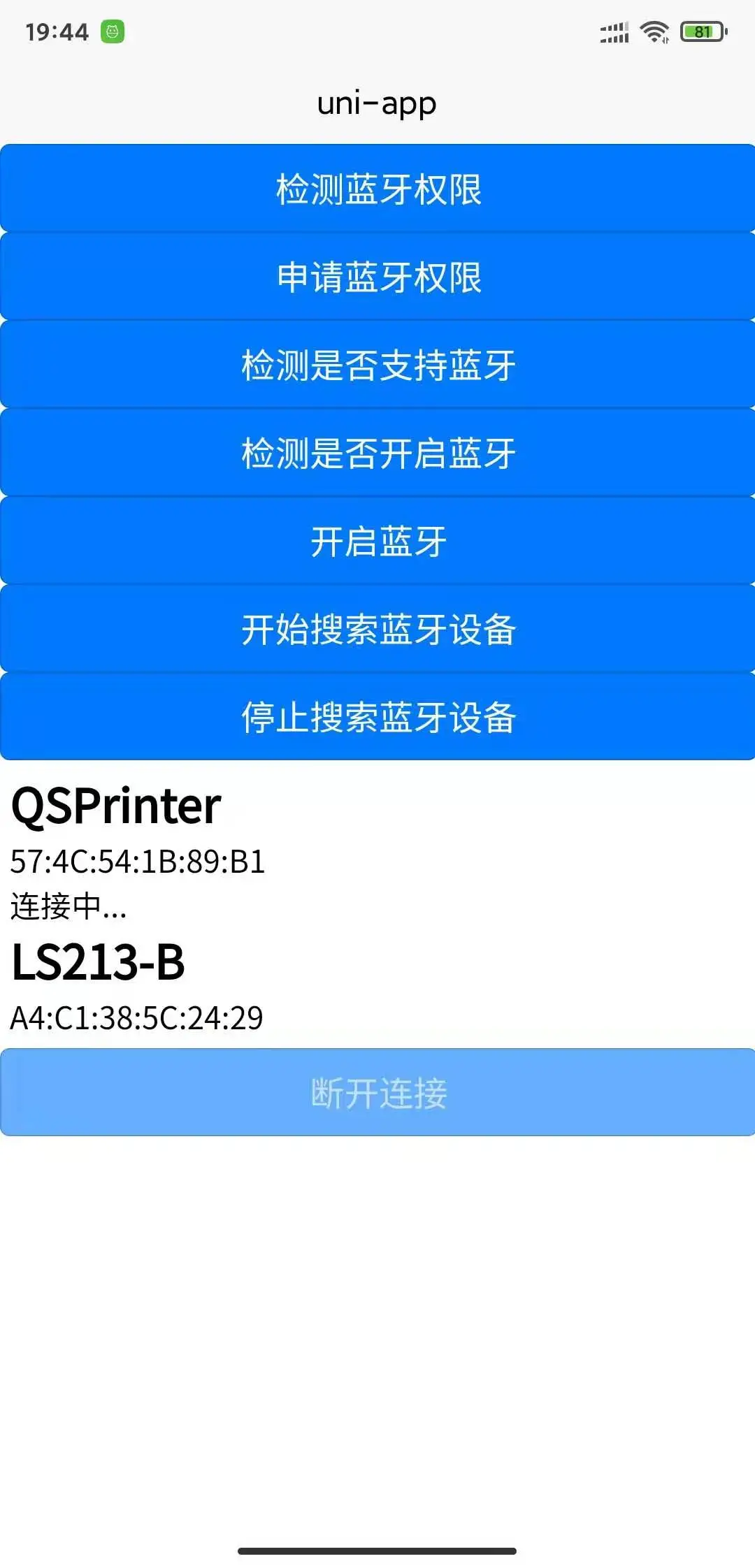因公司业务需要开发蓝牙打印机功能,首先使用的就是uniapp官方提供的API中的低功耗蓝牙相关命令,在使用中碰到无法发送大批量数据的情况,正发送就断开链接了,十分无奈,只好转而研究原生插件,刚好手上有佳博打印机安卓SDK示例工程,就基于此提炼出一个原生插件,一方面解决了我的问题,一方面也希望能解决同样碰到该问题的你。