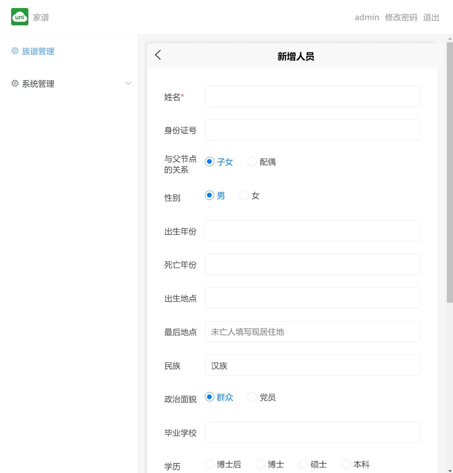 本系统包含家谱的完整功能,浏览、新增、修改、删除均支持。