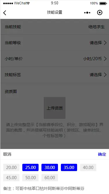 | defaultArr | String | "" | 默认值:多选是逗号分割的字符串,格式:"25.00,30.00,35.00" |