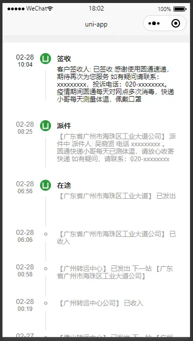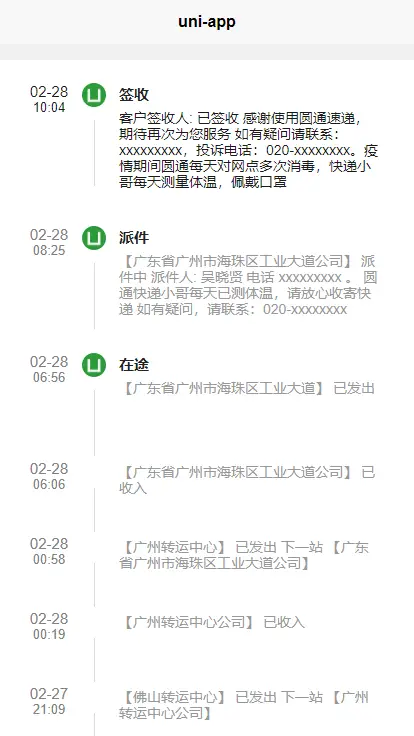 "context": "客户签收人: 已签收 感谢使用圆通速递,期待再次为您服务 如有疑问请联系:xxxxxxxxx,投诉电话:020-xxxxxxxx。疫情期间圆通每天对网点多次消毒,快递小哥每天测量体温,佩戴口罩",
