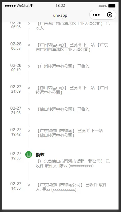 "context": "【广东省佛山市禅城公司】 已收件 取件人: 吴xx (xxxxxxxxxxx)",
