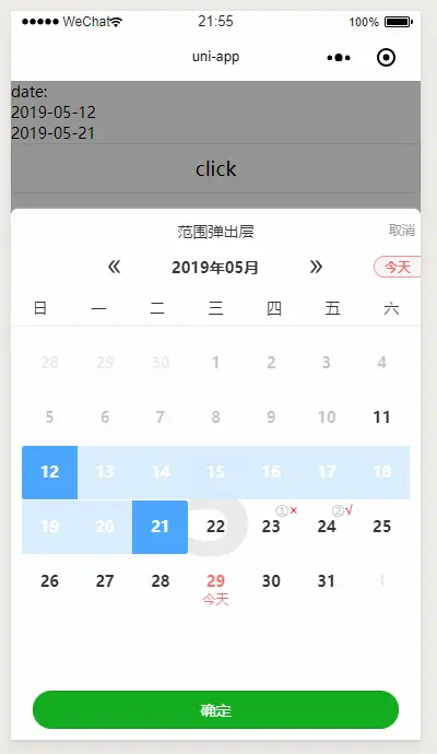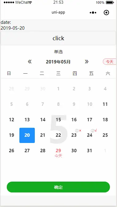 | click | 单元格点击事件 | 选中单元格的数据{ isDisabled: '是否禁用', year, month, day, date, time, format, virtual: '是否是虚拟日期(上下个月的日期)', isToday, customDate: '自定义日期数据'} |