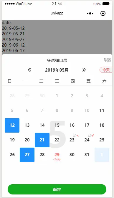 | customDate | 设置自定义选中的日期,每个选中值的数据可为string(默认样式为右上角红色的点)或object,object方式,可为选中的日期添加自定义的文本跟样式,object属性具体参考下表(function的话只能返回object[],参数为当前日期) | array/function | — | — |