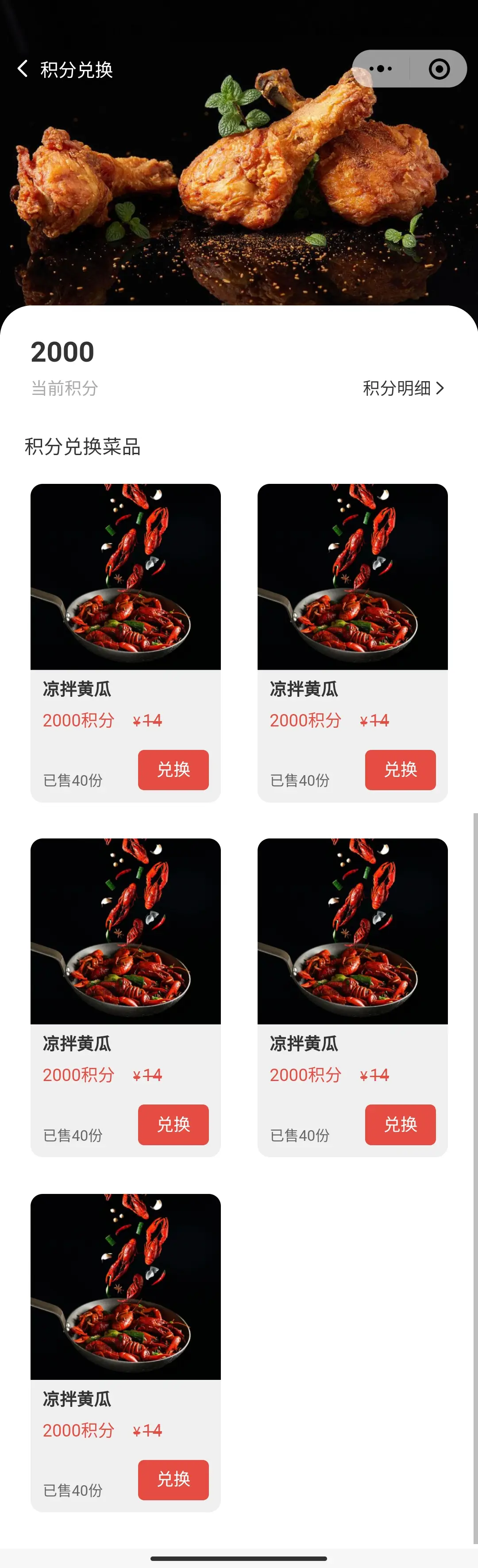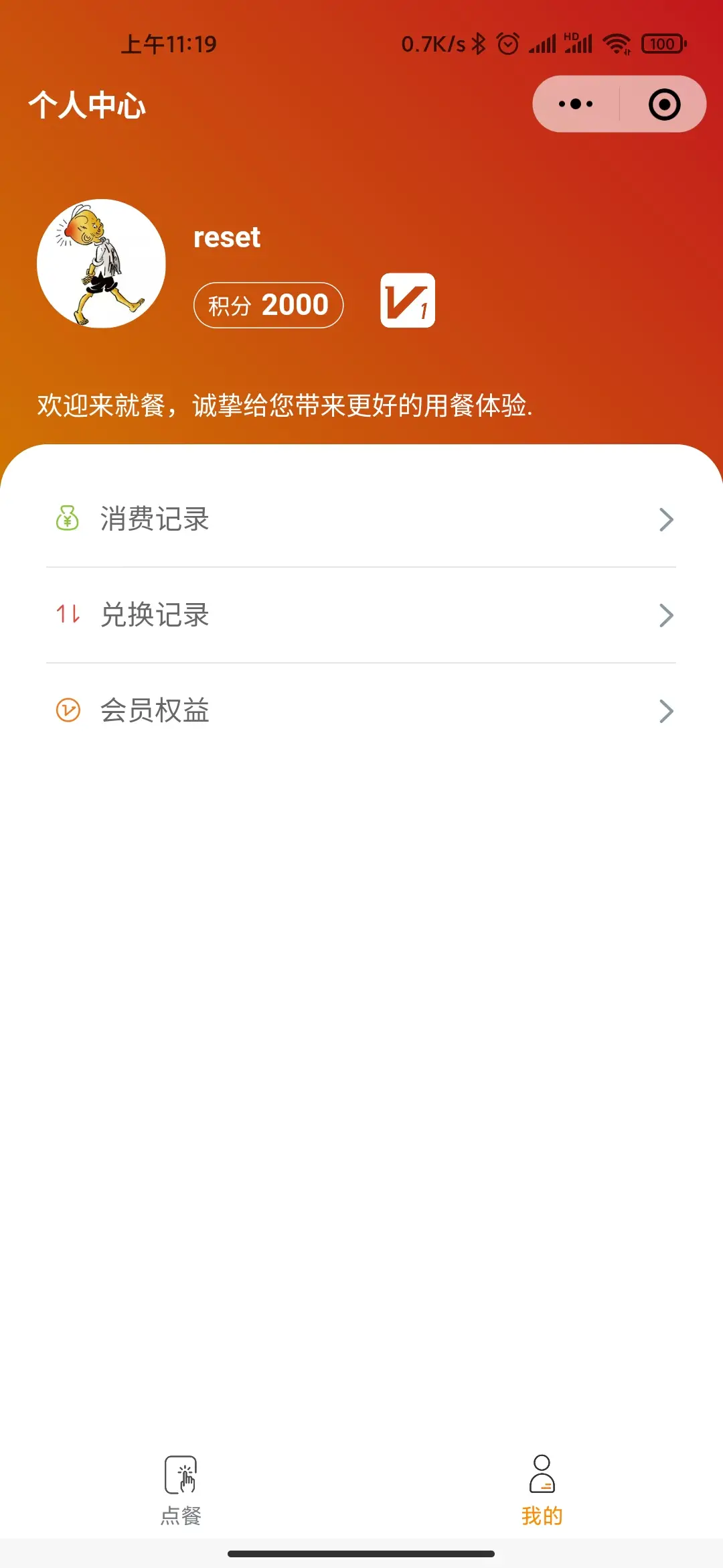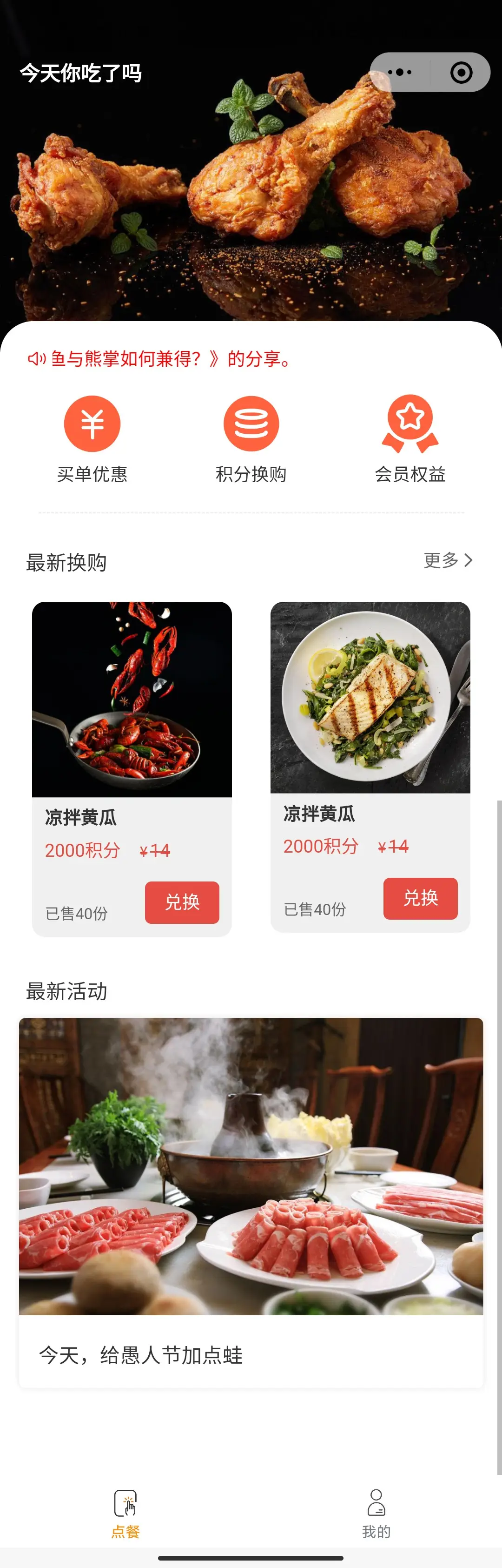 餐饮类模板,包含登录、积分兑换、买单支付、消费记录、兑换记录、个人资料、会员权益、最新活动等