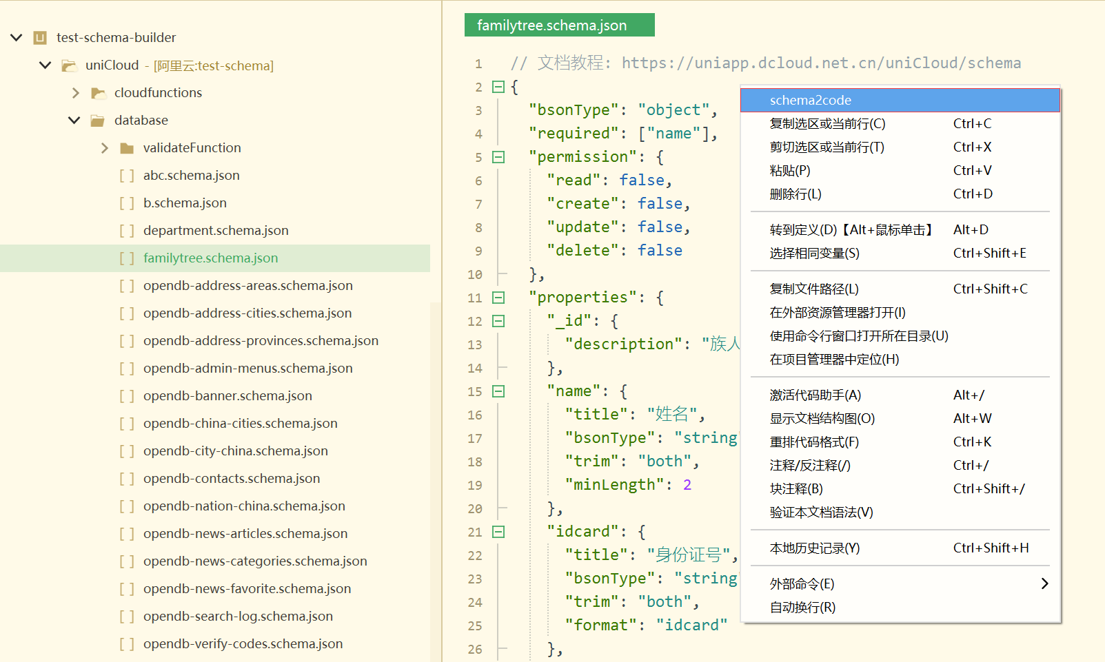 schema2code的详细文档: https://uniapp.dcloud.net.cn/uniCloud/schema?id=autocode