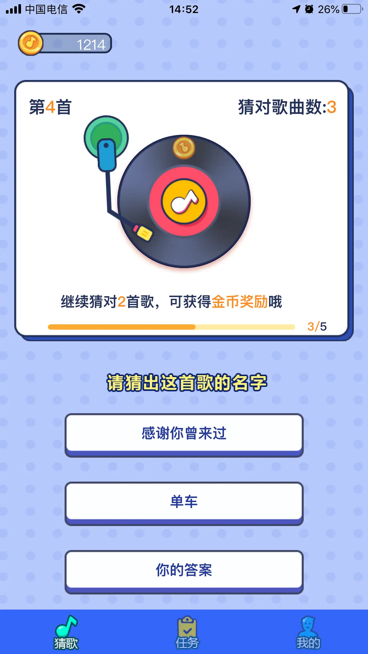 - 玩家猜错歌曲可以通过观看激励视频广告复活一次,否则连对奖励会重置,不能得到任何奖励