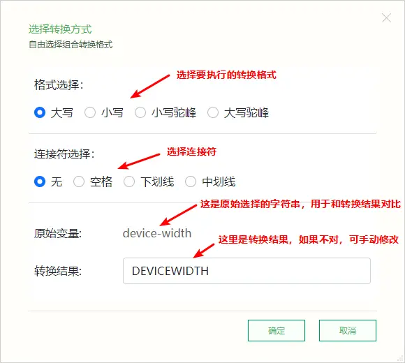 - 再选择转换格式(大写/小写/小写驼峰/大写驼峰)和连接符(无/空格/下划线/中划线)即可把选中的内容替换成最终生成的格式