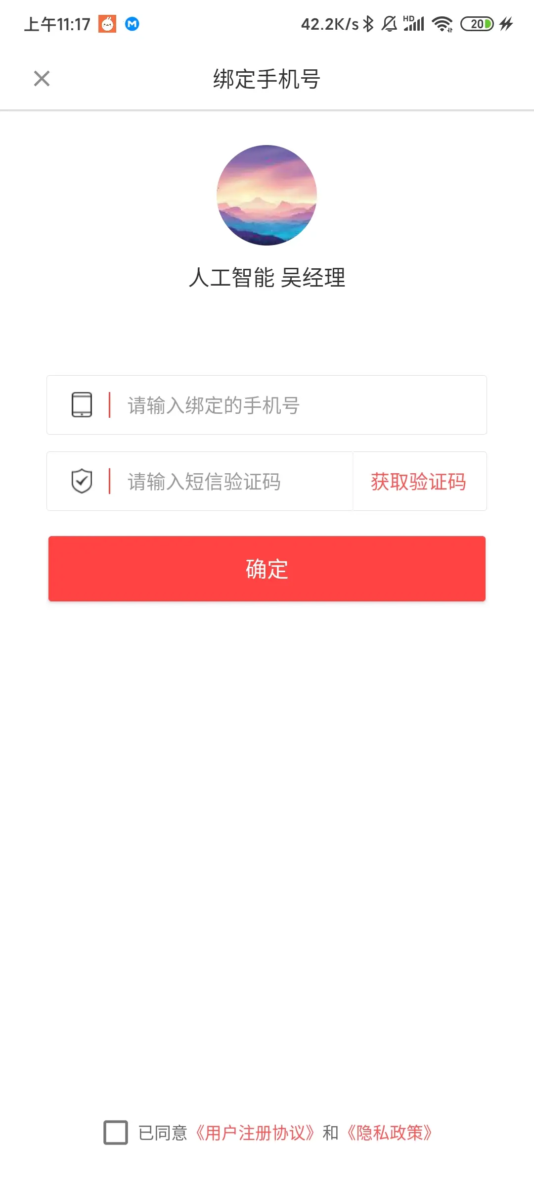 绑定手机号-VUE模板 布局、样式、JS分离 人工智能吴经理 请输入绑定的手机号 请输入短信验证码 获取验证码 确定 已同 《用户注册协议》 和 《隐私政策》