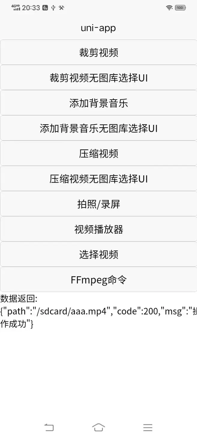 1.添加FFmpeg命令接口。 2.添加视频裁剪无图库选择接口。 3.添加视频加背景音乐无图库选择接口。 4.添加视频压缩无图库选择接口。
