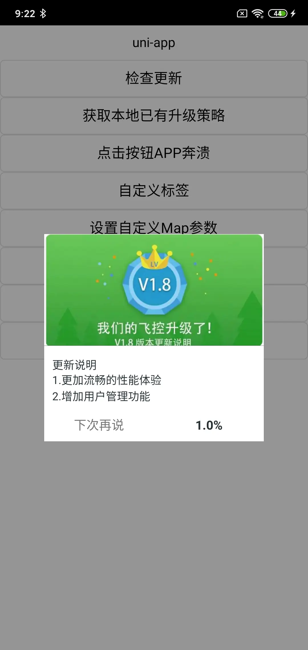 其他常用参数: autoCheckUpgrade: 是否自动检查升级 autoDownloadOnWifi: wifi网络是否自动下载新包 autoDownloadOn4g: 4G网络是否自动下载新包 style: default: 默认样式,bugly后台如果设置了banner图片无法显示 banner:图标样式,bugly后台如果设置了banner图片可以正常显示 bannerNoTitle:没有标题的banner样式 simple:简约样式 custom:自定义样式