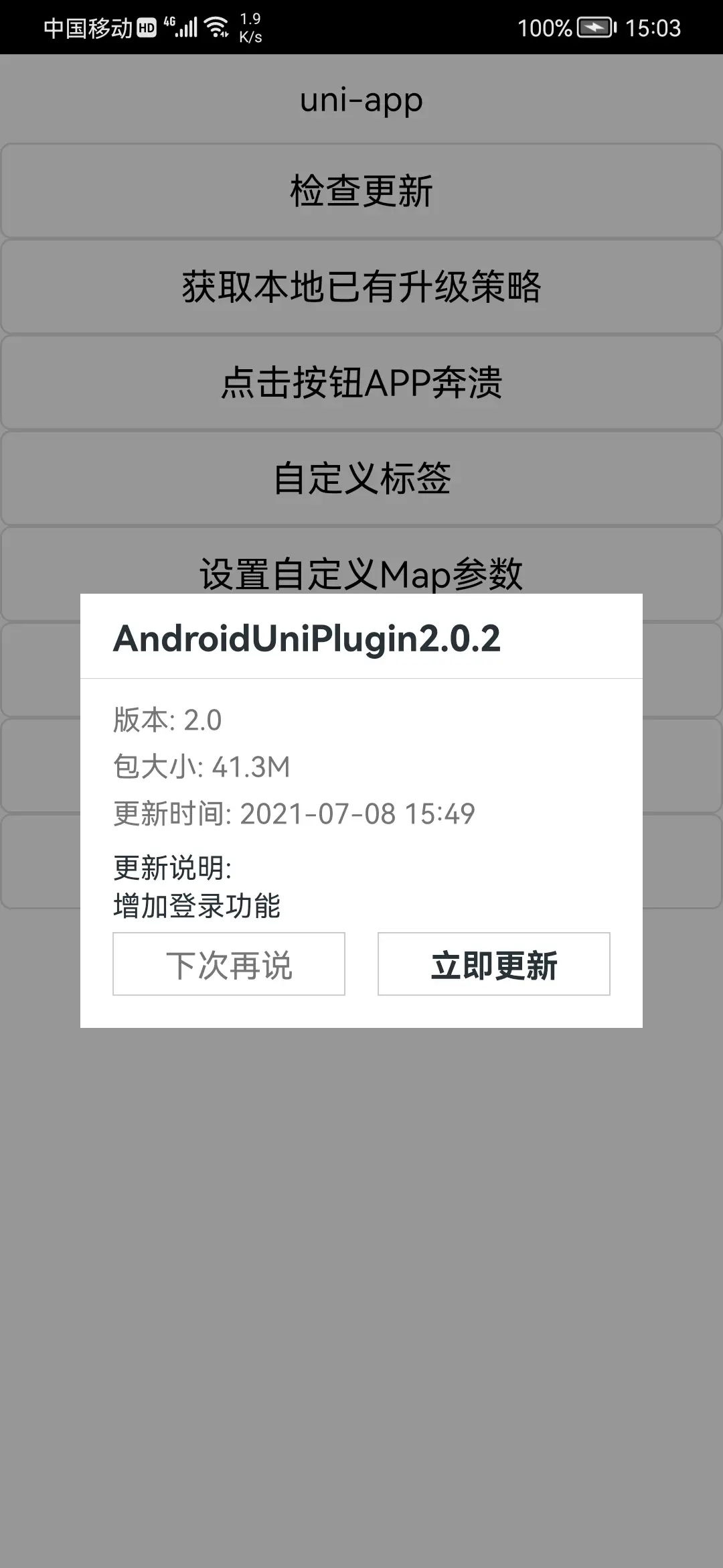 <button @click="getUpgradeInfo">获取新版app的版本信息(Android获取的是本地已有升级策略,iOS获取的是商店新版信息)</button>
