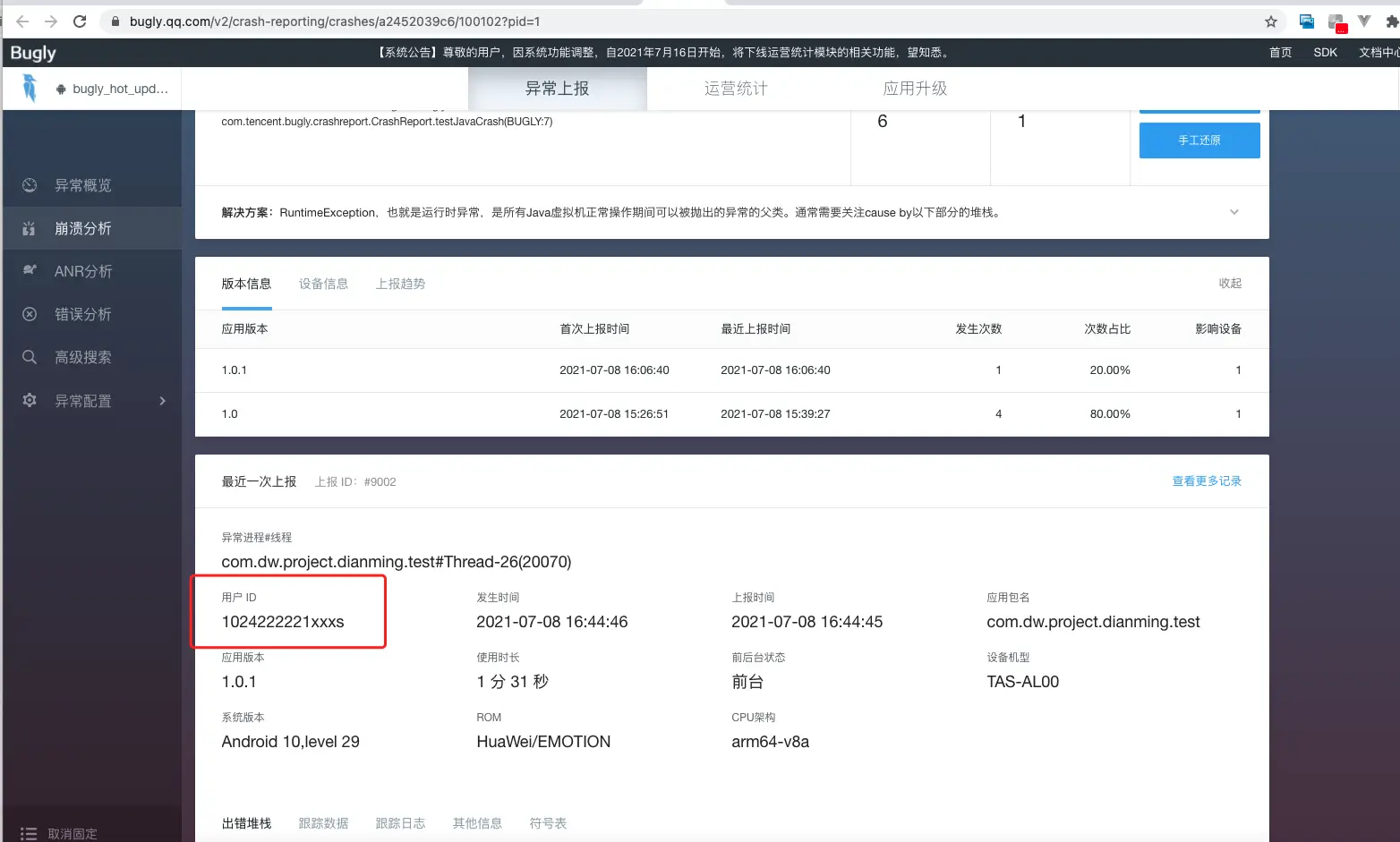 设置用户ID 您可能会希望能精确定位到某个用户的异常,我们提供了用户ID记录接口。 例:网游用户登录后,通过该接口记录用户ID,在页面上可以精确定位到每个用户发生Crash的情况
