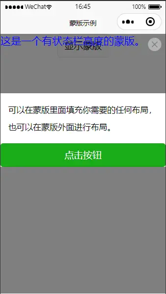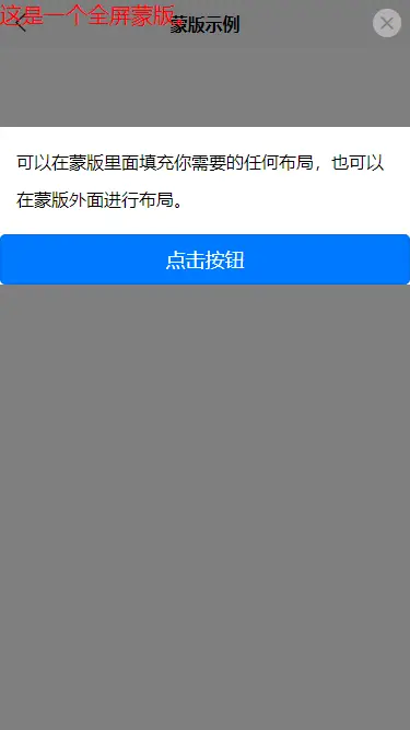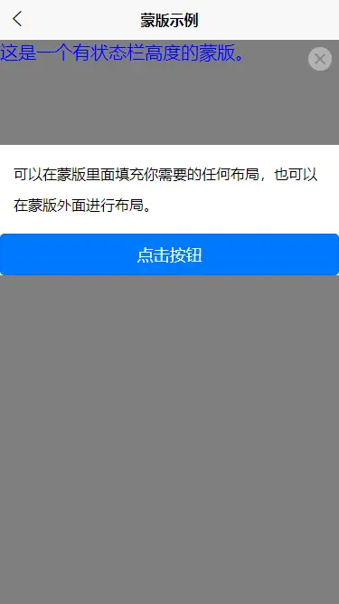 - 这里z-index属性设置值超过997后为全屏蒙版(将会遮盖状态栏),将会覆盖状态栏。当值小于等于997,将不遮盖状态栏,在状态栏下形成蒙版。所以在开发中请合理设置z-index值大小,这里默认值为99,不会覆盖状态栏。如不需要全屏蒙版,则不需要重新设置z-index值大小。