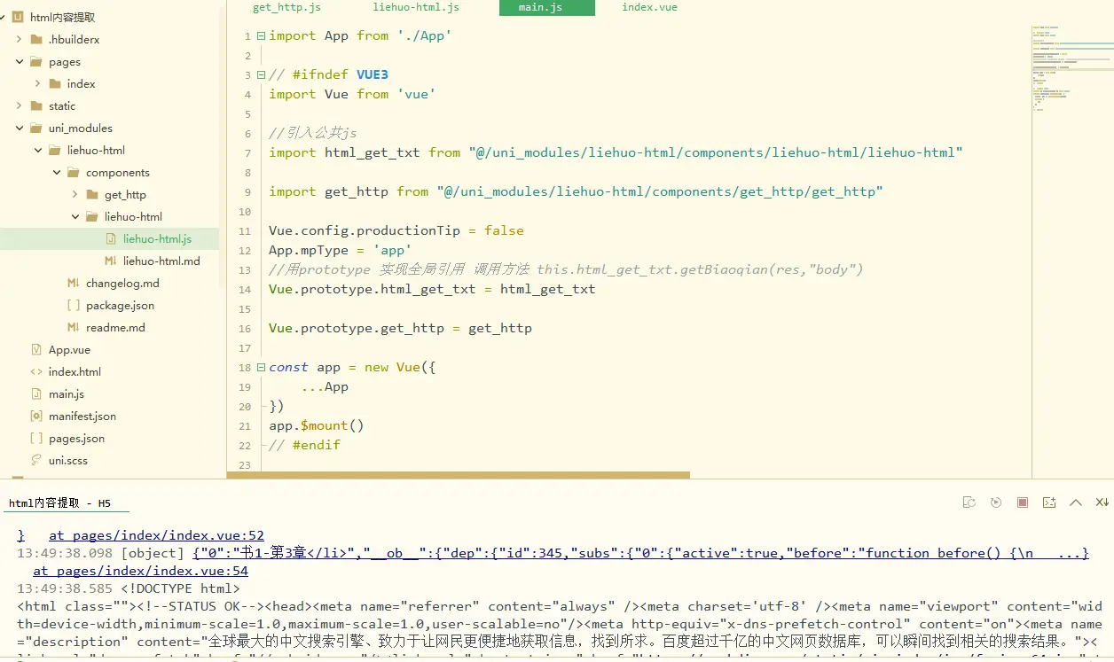 在 在main.js中全局引入 网络请求和html内容提取.js即可