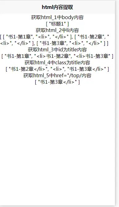 | [getTags] | Array | - | 获取指定标签名包裹的内容 传入参数1 解析内容 参数2 div、li、style等 注意:该方法只能找 如:XXXXX这类不加CLASS的标签 |