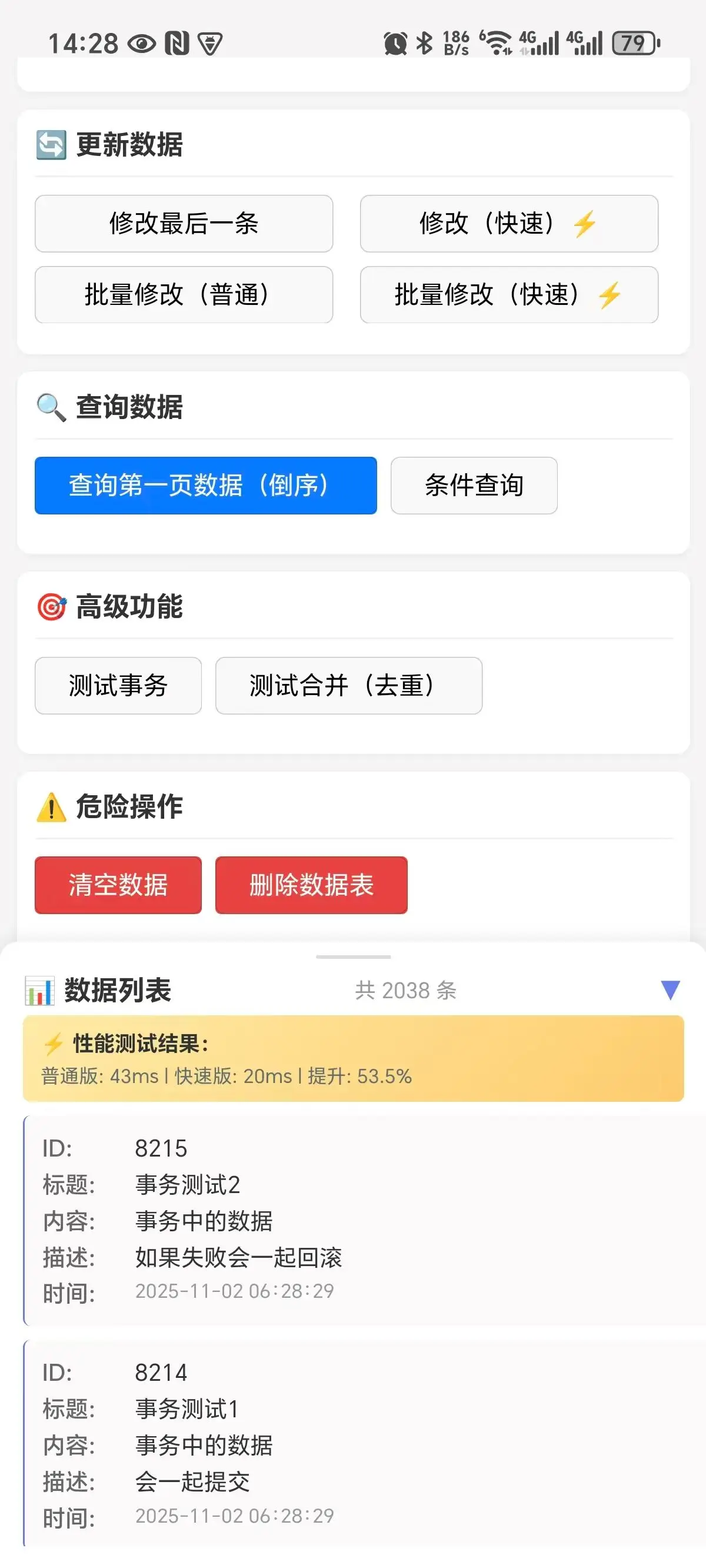 insertDataFast(tableName, data)- 无额外逻辑,最快速度insertBatchFast(tableName, dataList)- 无额外逻辑,最快速度updateDataFast(tableName, setData, whereObj)- 无额外逻辑,最快速度updateBatchFast(tableName, dataList, primaryKey)- 无额外逻辑,最快速度