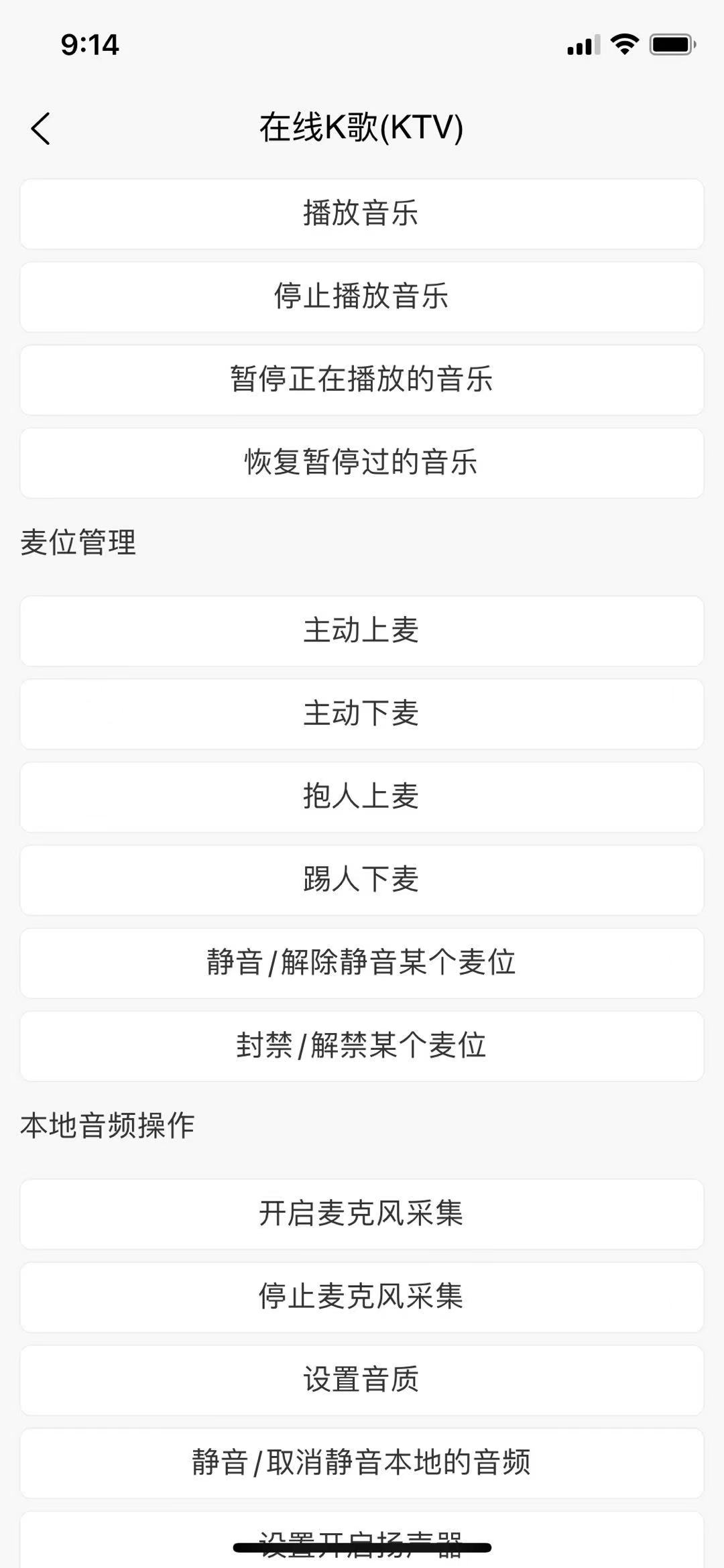 房主创建新的 Karaoke 房间开播,听众进入 Karaoke 房间收听/互动。 房主可以管理点歌、将座位上的麦上主播踢下麦。 房主还能对座位进行封禁,其他听众就不能再进行申请上麦了。 听众可以申请上麦,变成麦上主播,上麦后可以点歌和唱歌,也可以随时下麦成为普通的听众。 支持发送礼物和各种文本、自定义消息,自定义消息可用于实现弹幕、点赞等。