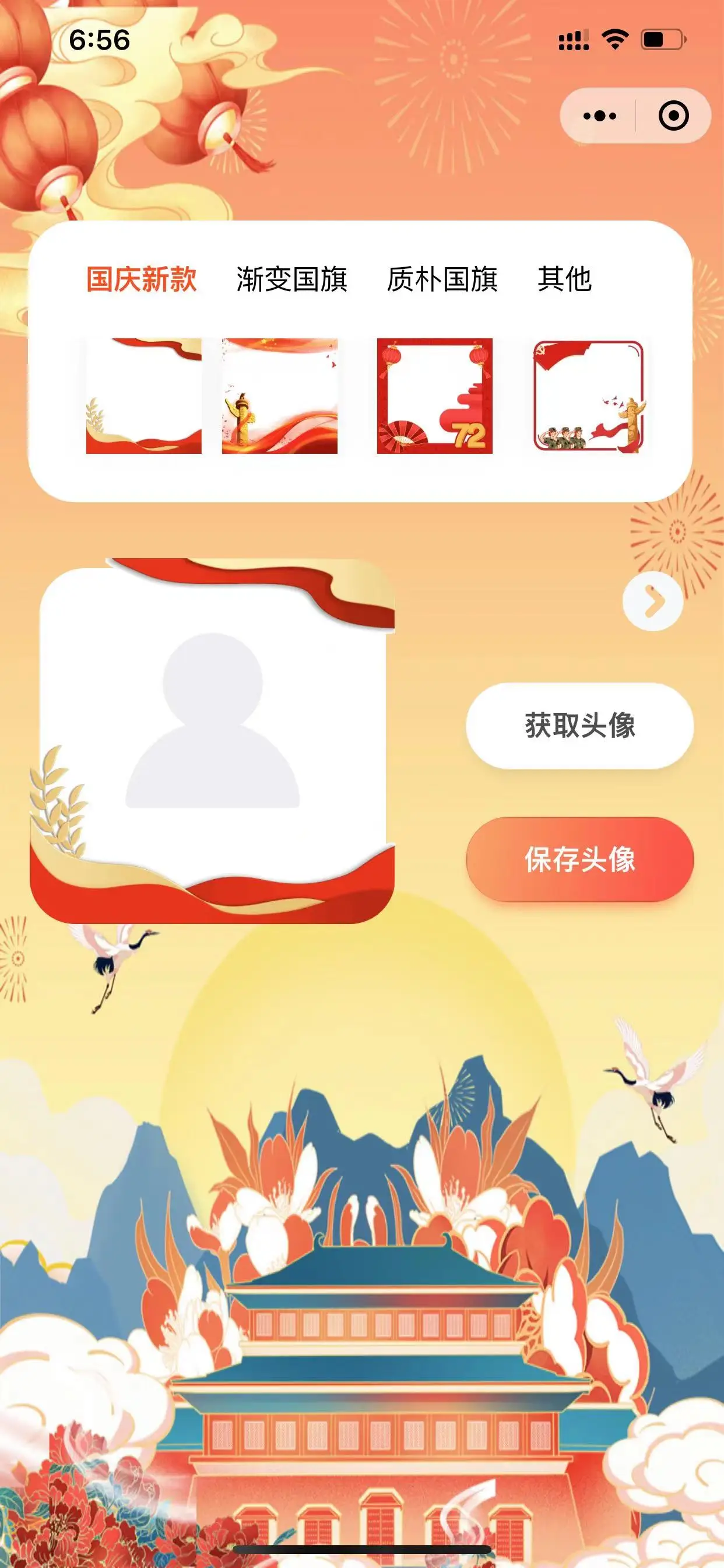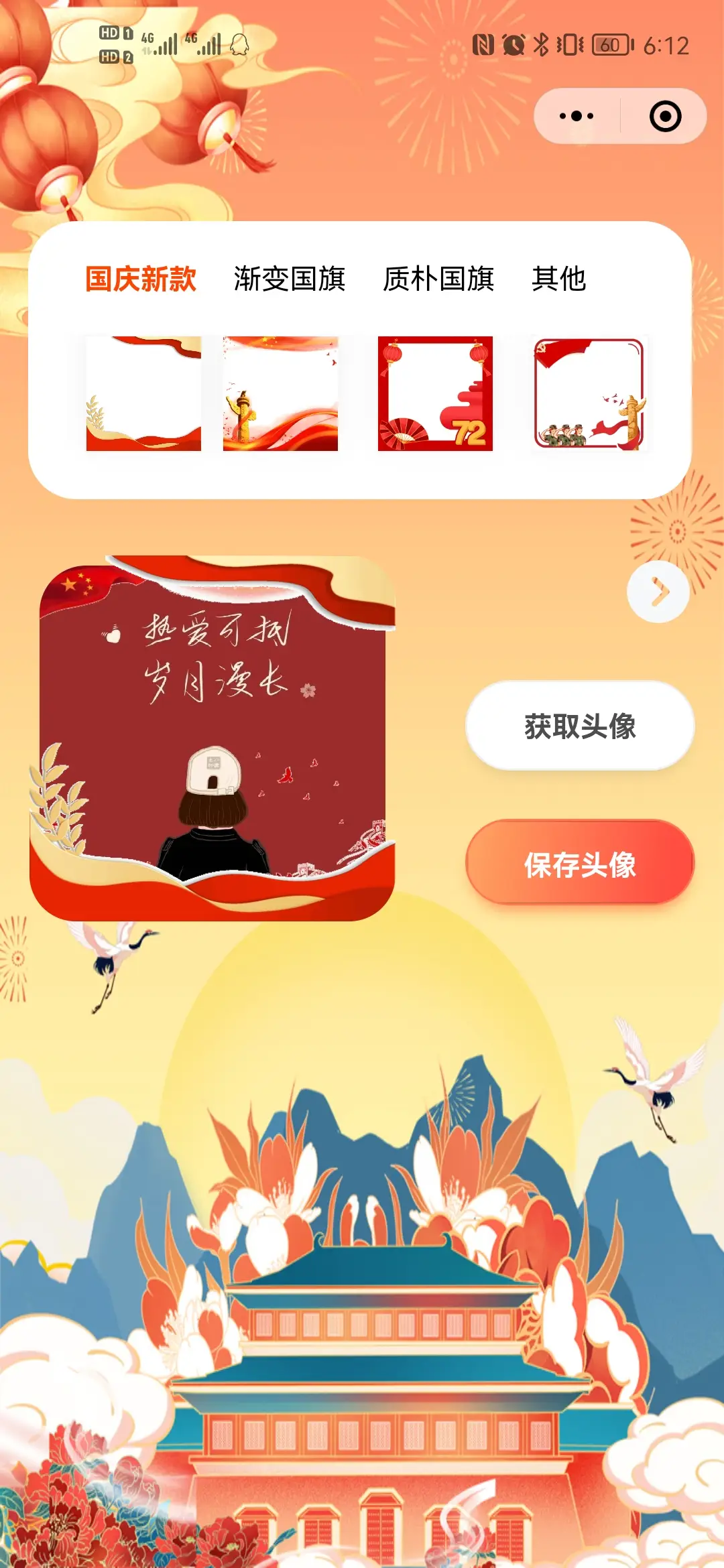 最近微信换头像比较火爆,国庆幻彩头像比较好看,这是一款实现微信头像增加挂件的示例。开箱即用,喜欢请点下start 。 如果你有更好的意见,可以联系我 QQ。