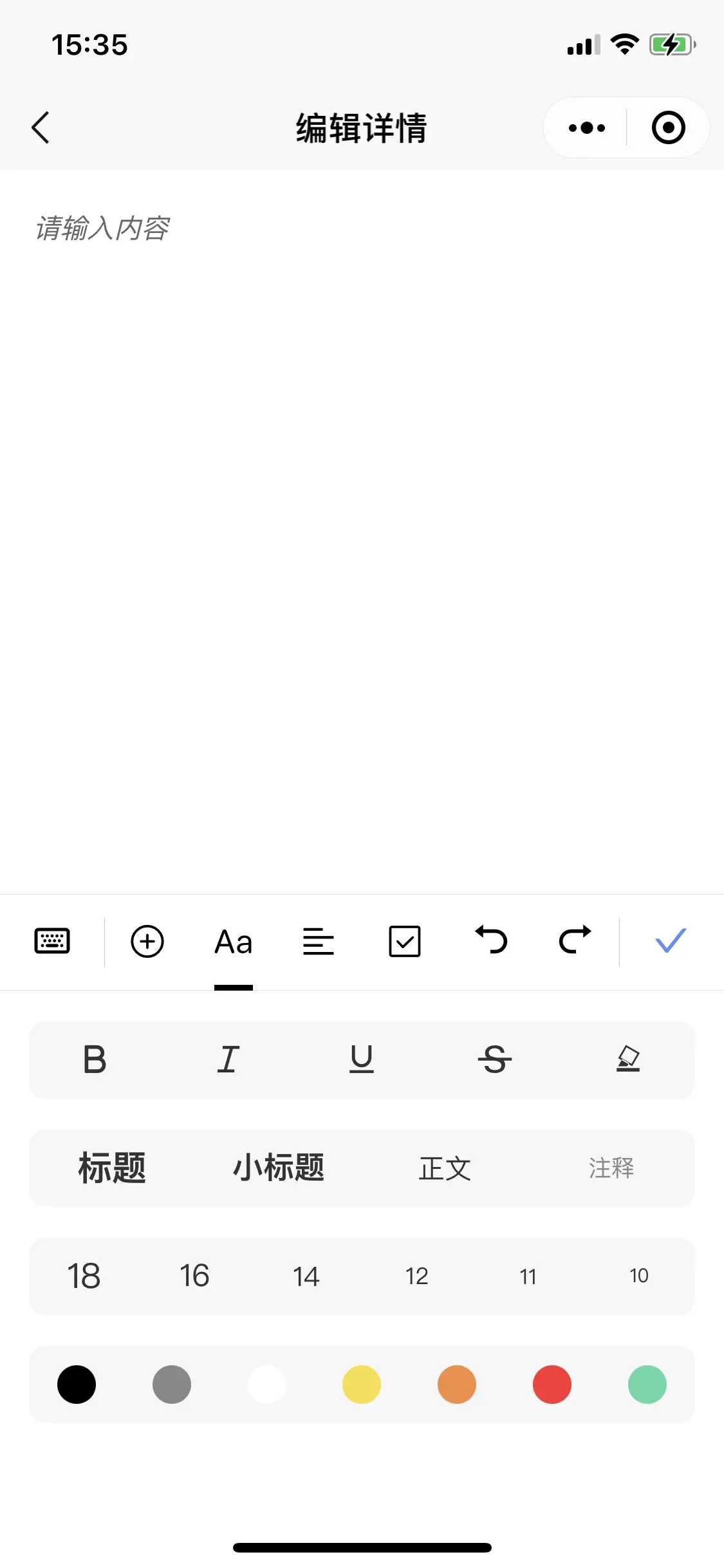 照着腾讯文档小程序开发了微信小程序富文本编辑器组件,这几天做个整理,如有这个需求可以前往腾讯文档小程序操作看看实际效果。毕竟参照的是微信自家小程序,无法做到百分百效果,只能按现有开放api尽可能实现。