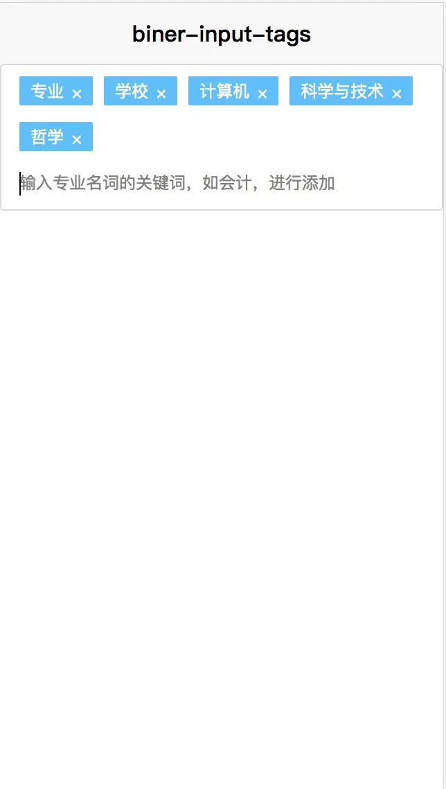 // 例如: <biner-input-tags @change="change" :selectlist='selectlist' :disabled='disabled' :placeholder='placeholder'></biner-input-tags> data(){ return { disabled:false,//不禁用 // 默认的数组 不填默认的是空数组 selectlist:[{ title:'专业' }], // 默认提示 placeholder:'请输入专业' } },