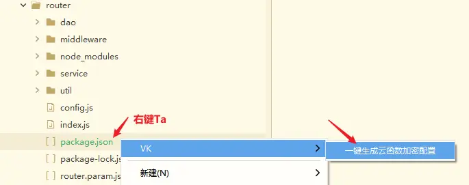 右键需要加密的云函数根目录下的 package.json 文件,点击VK-一键生成云函数加密配置