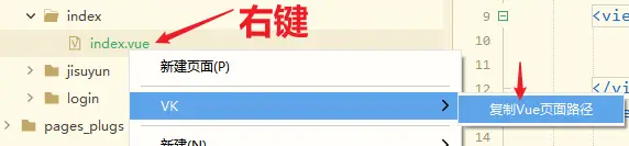 在.vue文件右键,点击VK-复制vue页面路径(同时支持在打开的文件代码编辑器中右键)