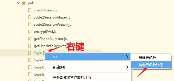 在云函数文件右键,点击VK-复制云函数路径(同时支持在打开的文件代码编辑器中右键)