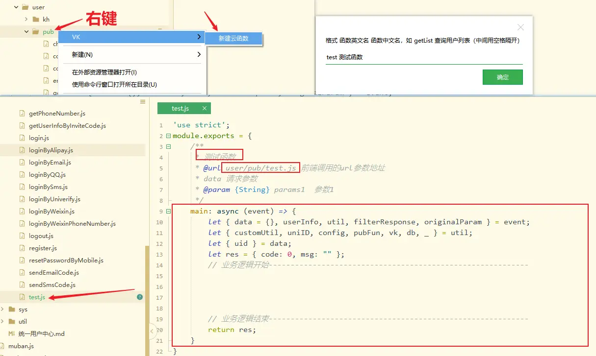 在需要新建云函数的目录右键,点击VK-新建云函数
