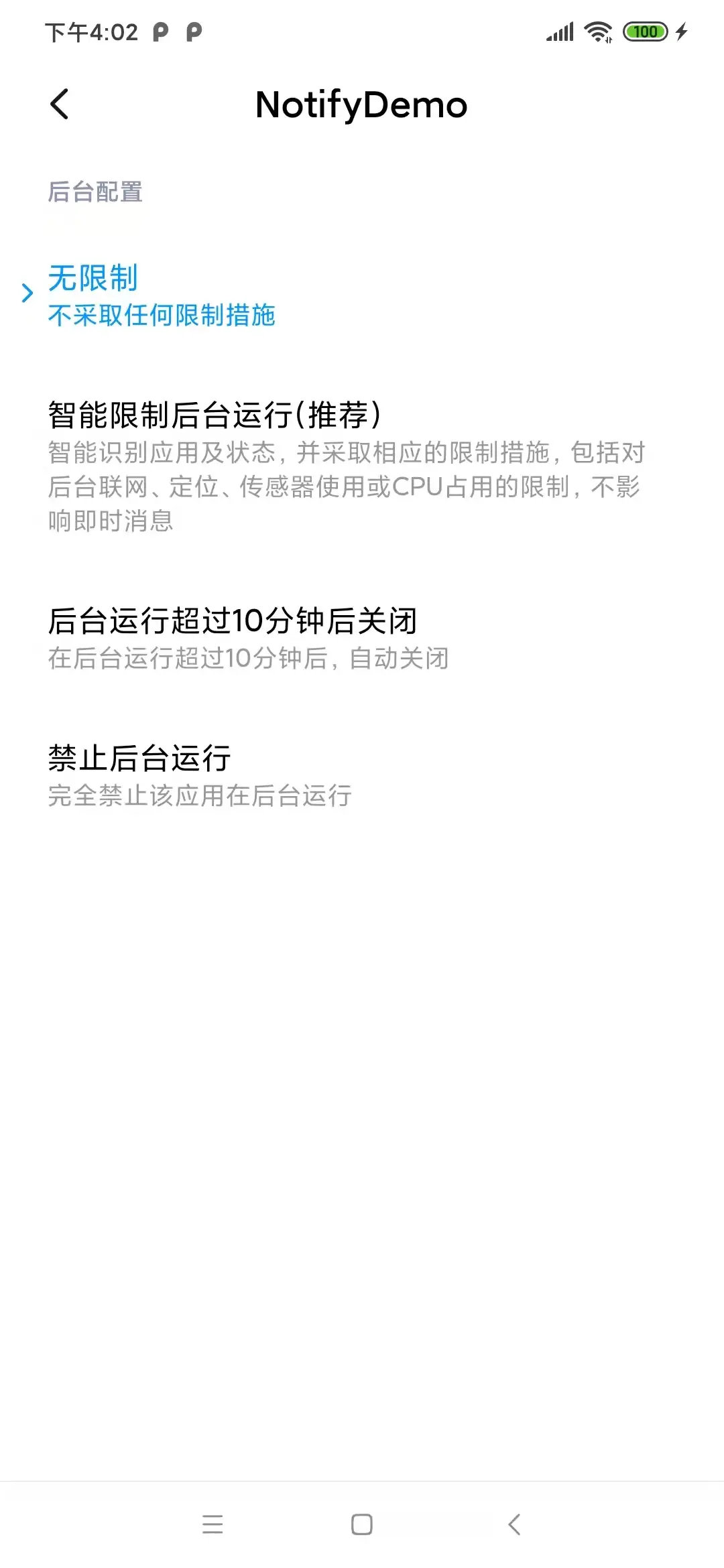 - 如果配置了自启动、电池管理等,即使用户主动关闭前端应用,后台进程也能够保持持续运行。