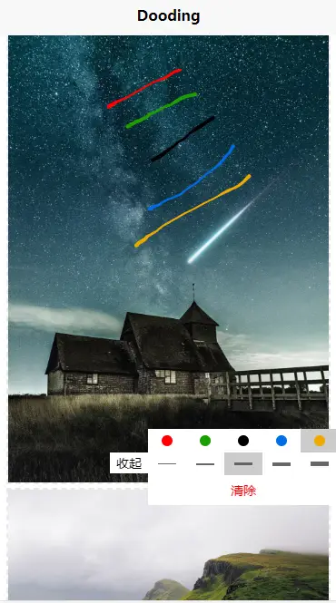 修改画笔颜色,直接在数组里添加颜色和选中状态,画笔大小同理,例子中放入了两张图片,存入了图片的具体信息,还存入了实例对象,具体那张图片有涂鸦痕迹的下标。