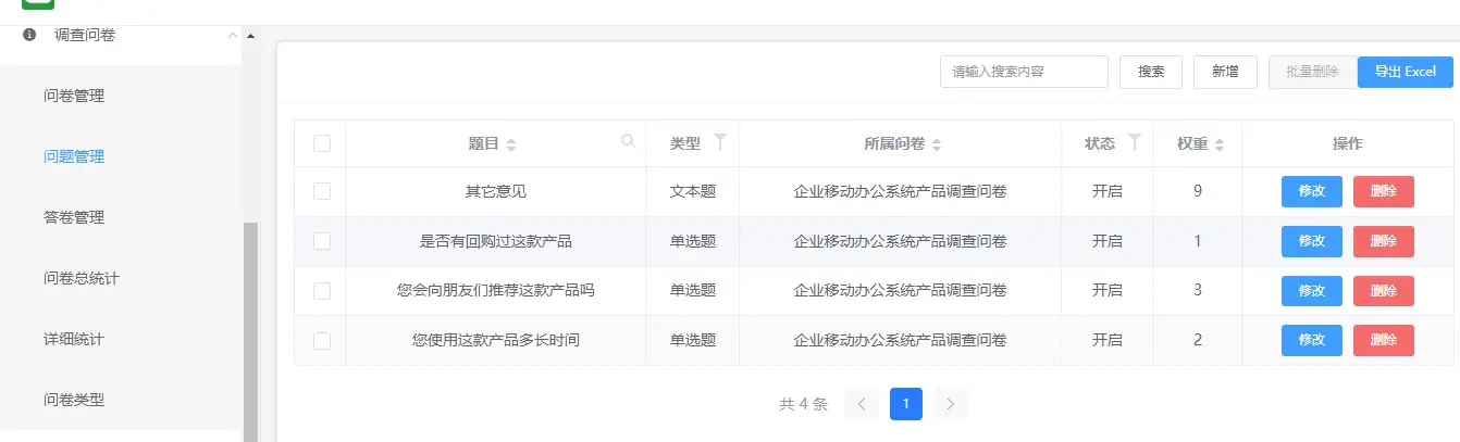 答: 需要先添加 ‘问卷类型’,添加‘问卷管理’,问题管理-新增