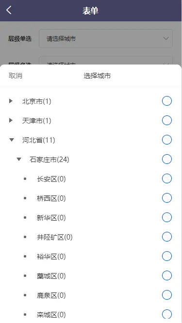<ba-tree-picker ref="treePicker" :multiple='false' @select-change="selectChange" title="选择城市"