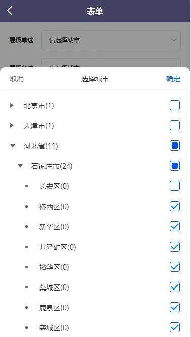 - 支持单选、多选、父级选择,当然也支持单层选择