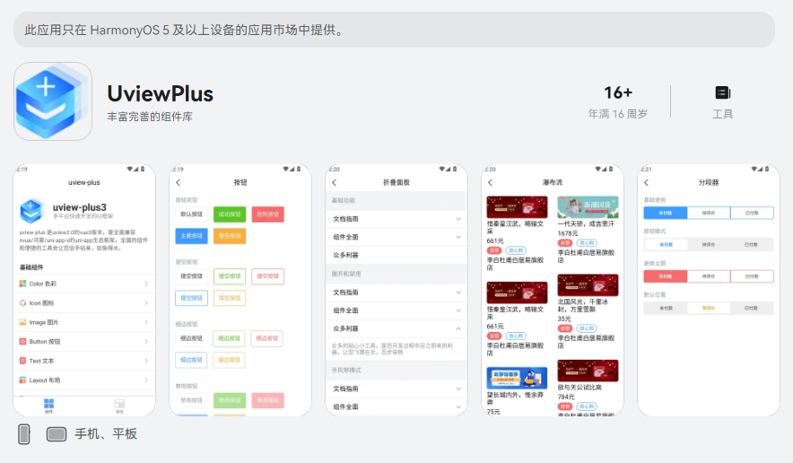 uview-plus,是uni-app全面兼容vue3/nvue/鸿蒙/uni-app-x(已经发布https://ext.dcloud.net.cn/plugin?name=uview-ultra)的uni-app生态框架,全面的组件和便捷的工具会让您信手拈来,如鱼得水。uview-plus是基于uView2.x移植的支持vue3的版本,感谢uView。