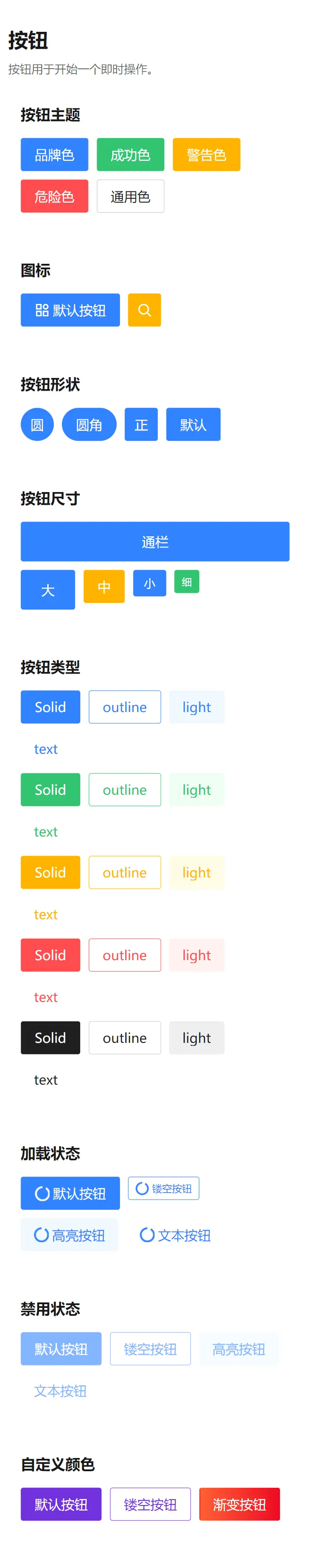 一个功能丰富的按钮组件,用于开始一个即时操作。支持多种类型、样式、状态和尺寸,可用于表单提交、页面跳转、信息确认等多种场景。组件提供了丰富的自定义选项,可以满足各种复杂的交互设计需求。