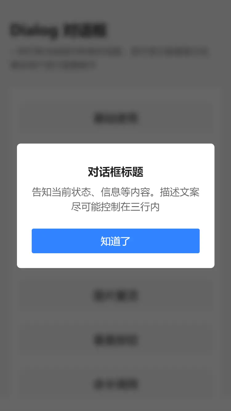 通过v-model绑定是事展示对话框,通过title设置对话框标题,content设置是对话框内容,confirm-btn设置确认按钮或确认按钮所有属性,