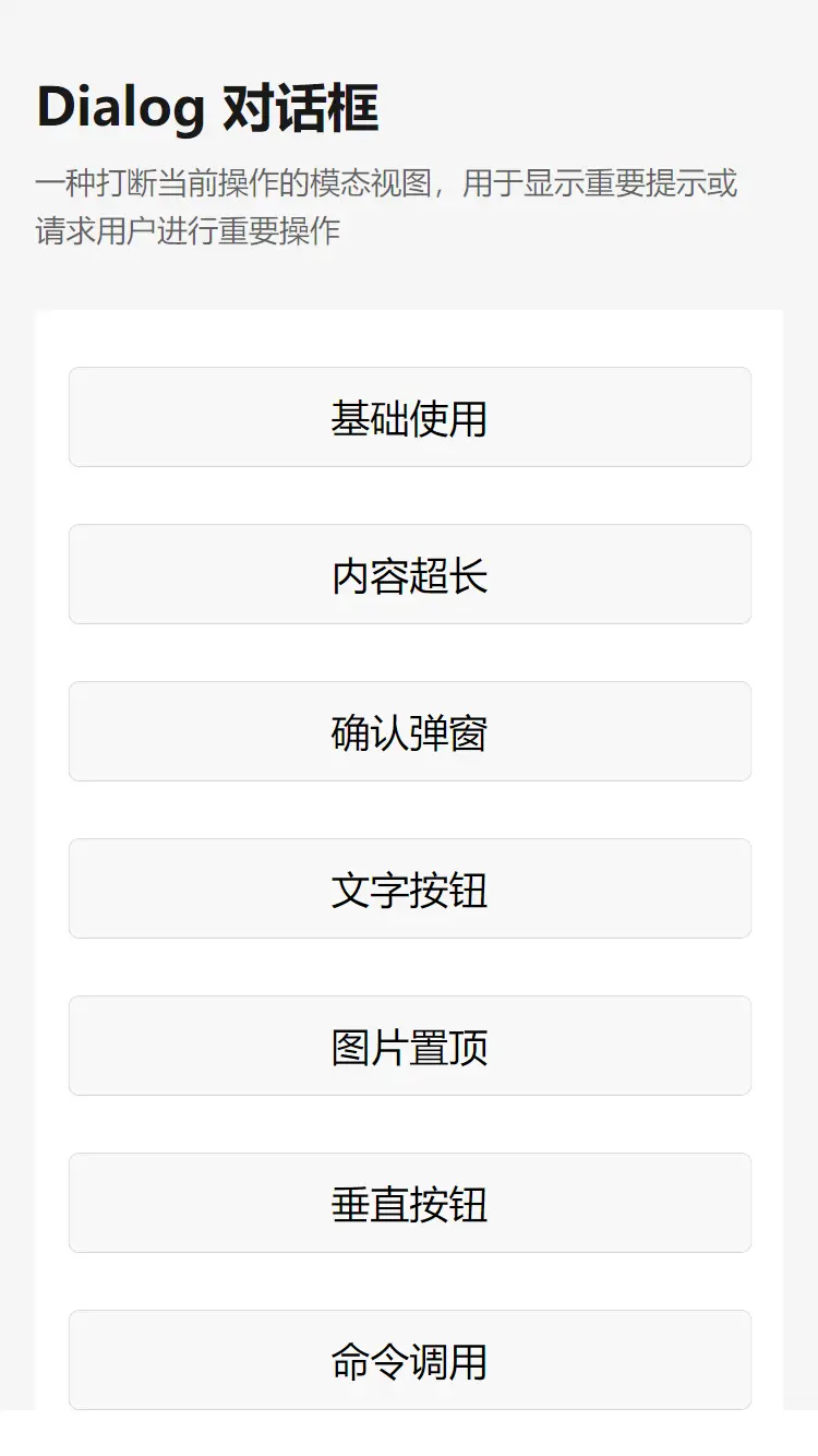 一个功能丰富的对话框组件,用于展示重要信息并获取用户反馈。支持标题、内容、确认/取消按钮、自定义内容等多种配置,可用于消息提示、确认操作、信息收集等多种场景。组件提供了组件调用和函数调用两种方式,满足各种复杂的交互需求。