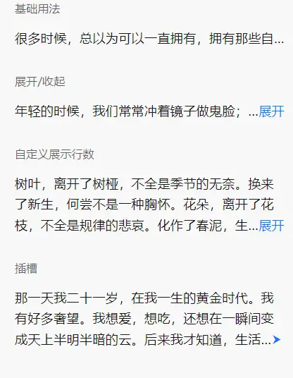<l-text-ellipsis content="很多时候,总以为可以一直拥有,拥有那些自己想要的快乐,用于那些自以为需要的一切,只是,却没发现,当心正开始从无到有慢慢接纳的时候。离失去也就不远了。" expand-text="展开" collapse-text="收起" />自定义展示行数