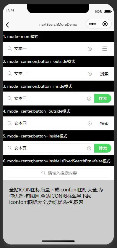 <view style="padding: 10px 0;background-color:#000000;color: #fff;font-size: 13px;"><text>6. mode=center;button=inside;isFixedSearchBtn=false模式</text></view>