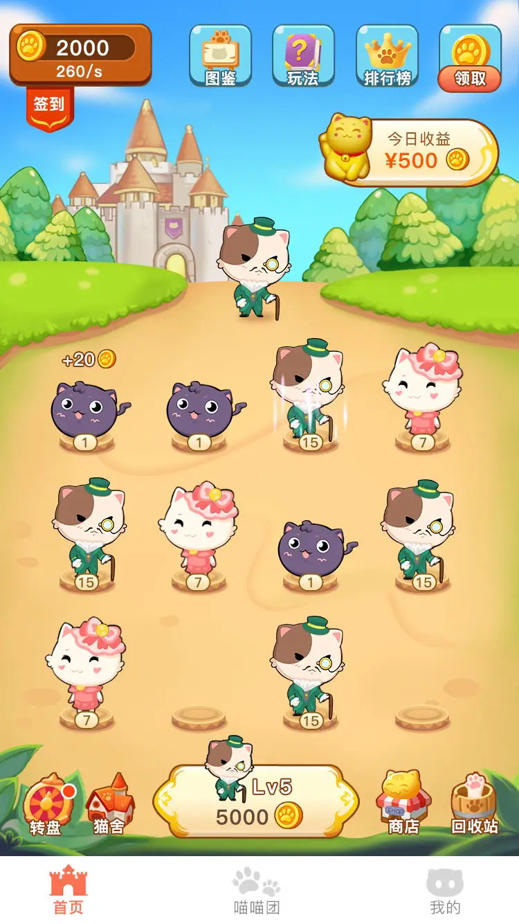 - 玩家通过签到、抽奖等方式赚取金币,使用金币购买低等级猫,将同级别猫合成为更高等级猫;