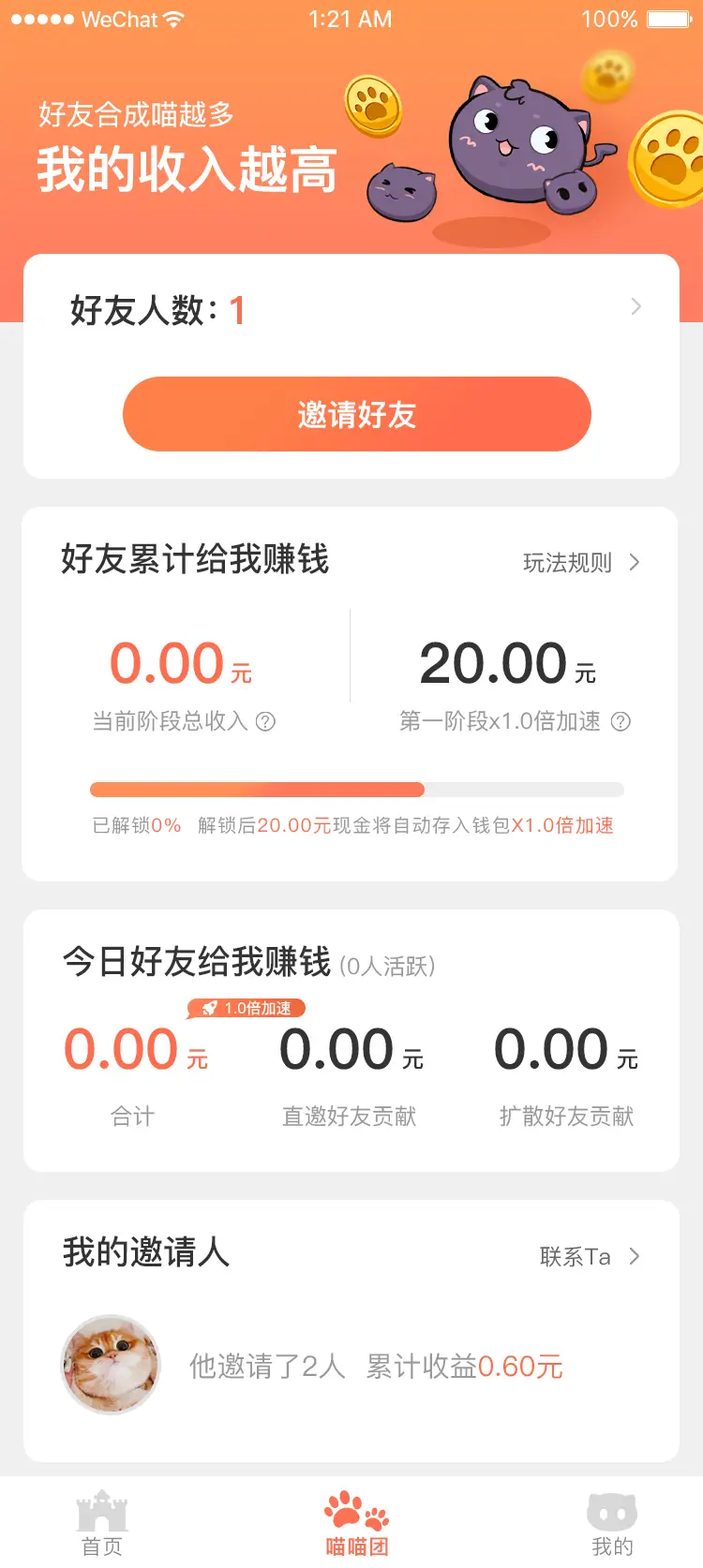 - 玩家通过邀请好友一起养猫,下线观看激励视频,邀请者可获得激励,可转为现金并在平台提现。
